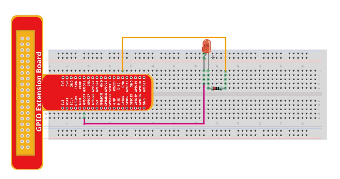 Прежде чем запускать программу, убедитесь, что светодиод подключен правильно. Не забудьте использовать резистор, чтобы ограничить ток через светодиод и предотвратить его (и ваш Raspberry Pi) повреждение!